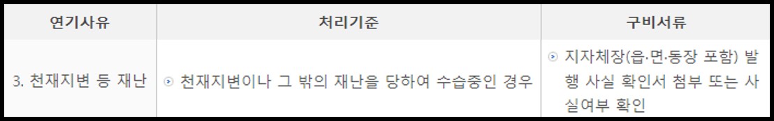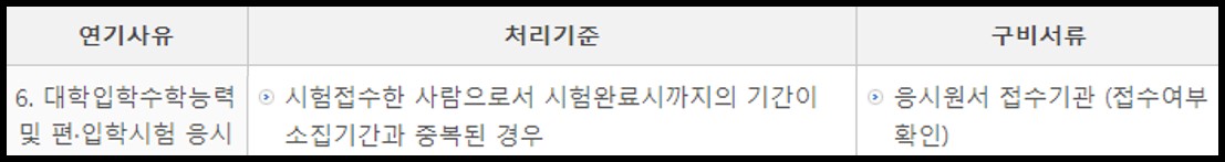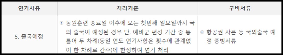 동원예비군을 연기하려면 법령에서 정하는 아래의 사유와 구비서류가 있어야 연기를 할 수 있습니다.